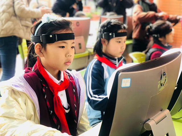 同学们在“大脑360”认知能力测训系统上,使用脑波灯测量大脑能力