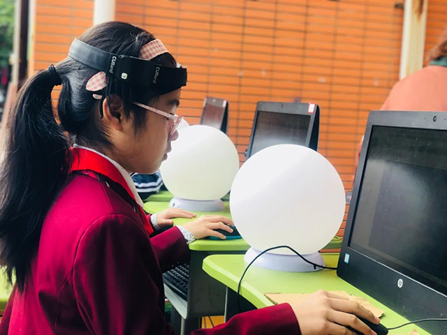 同学们在“大脑360”认知能力测训系统上,使用脑波灯训练注意力