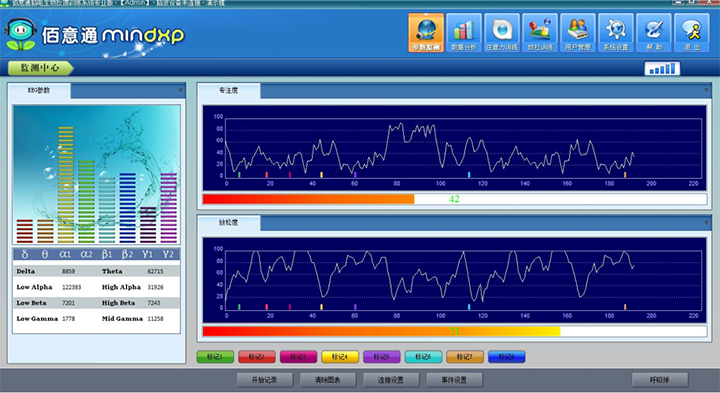佰意通脑放松训练:集成音频播放器,支持自定义添加脑波放松音乐,支持音乐反馈控制和图像反馈控制等多种反馈模式。支持训练结果的统计分析,可设置统计分析区段,并以曲线图、柱状图、饼图等图表形式显示分析结果;支持训练效果评价,并自动生成报告,提供报告导出功能。支持多用户管理及训练记录管理,可查询和导出训练记录;支持使用思语脑波灯进行脑电反馈训练。