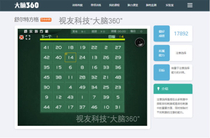 视友科技“大脑360” 中的选择性注意训练项目——舒尔特方格