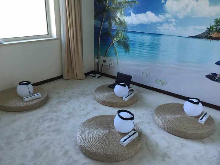 首先,放松冥想室的布置是多么的温馨舒适啊!房间主色调为干净的蓝绿色,据说蓝色是梦幻般的颜色,最容易使人产生心灵冥想,排除繁杂;小盆栽的绿色植物点缀室内,是那么的清新自然,生命的颜色永远都是快乐的象征;地板使用软材质铺设,如地毯,避免走路的声响影响放松效果;几个圆圆的大垫子摆在地上,围成一圈,天然藤草编做,散发质朴自然气息,清凉舒适,大家盘腿而坐,实在是很有意思;播放由放松音乐、自然声音、放松冥想指导语等组成的专业放松音乐。室内没有其他的杂物,一切都是令人觉得那么的温馨舒适。可以说,每一个细节都体现了设计者的良苦用心!