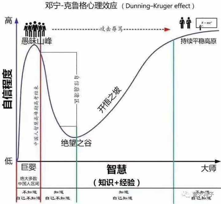 由此,Kruger和Dunning总结得到了一条定律:邓宁—克鲁格效应(D—K effect)。在Kruger和Dunning看来,人们的这种迷之自信,实际上是一种认知偏差现象。而能力欠缺的人由于自我认知的偏差,导致无法正确认识自己的不足,转而沉浸在自我营造的虚幻优势之中,以至于常常高估自己的能力,却无法客观地评价他人的能力。考得好,就觉得自己聪明,考得差,就觉得题目太难、改卷太严,各种甩锅。