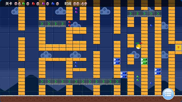 小鸟头顶的颜色条指示当前的专注度水平,颜色条中绿色部分越多,表示专注度越高。方向键控制小鸟的左右运动。在小鸟飞行过程中,可能会得到一些道具:红水晶、蓝水晶、绿水晶或粉水晶等,得到这些道具便可得分,并可以打开对应颜色的石头。