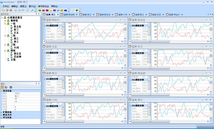 (1) 迈思睿团体版采用CUBand脑波仪进行脑电数据实时采集,全面整合分析实时脑电数据与行为训练数据;教师端可组织进行团体认知测评、团体量表测评、团体脑电参数监测等多项团队测评任务,以及团体认知能力训练、开放式情景训练、开放式引导训练、团队脑电对抗训练、团队脑电协同训练等多项团队训练任务;学员同时使用思语脑波灯进行同步脑电反馈训练