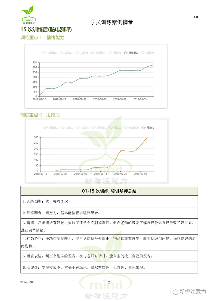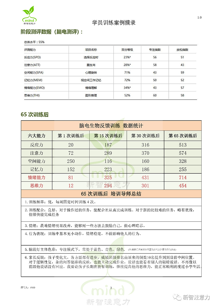 2. 每经过一段时间训练之后,新智注意力提供阶段训练报告,家长能看到学员每一个训练项目的详细记录。从脑波曲线看,孩子有明显的提升;小学班主任向家长反馈,孩子在一个月的时间内改善明显,家长因此主动增加训练次数(从每周2次增加到3次)。